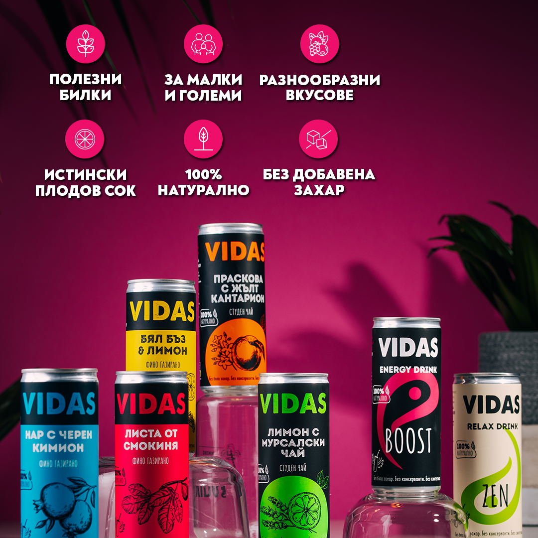 Харесвам VIDAS, защото са изцяло натурални и без добавена захар. Обичам да ги пия в компанията на семейството и приятелите. любимият ми вкус е като любимият ми цвят - бял бъз с лимон.