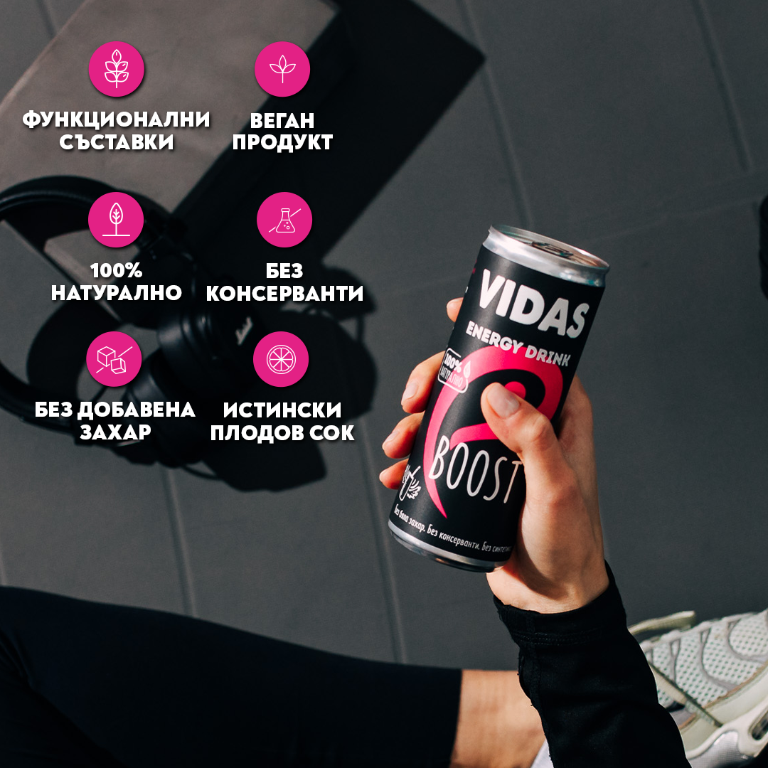 Представи си живот, в който разполагаш с безкрайна енергия. Представи си енергийна напитка, която не е бъкана с вредни съставки. Мда, това е твоят живот, мда, това е нашата напитка. VIDAS Boost носи енергия от чист екстракт от гуарана и витамини Б.