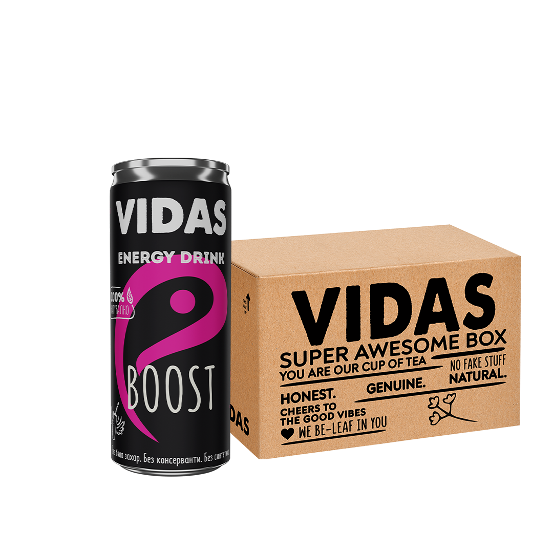Представи си живот, в който разполагаш с безкрайна енергия. Представи си енергийна напитка, която не е бъкана с вредни съставки. Мда, това е твоят живот, мда, това е нашата напитка. VIDAS Boost носи енергия от чист екстракт от гуарана и витамини Б.